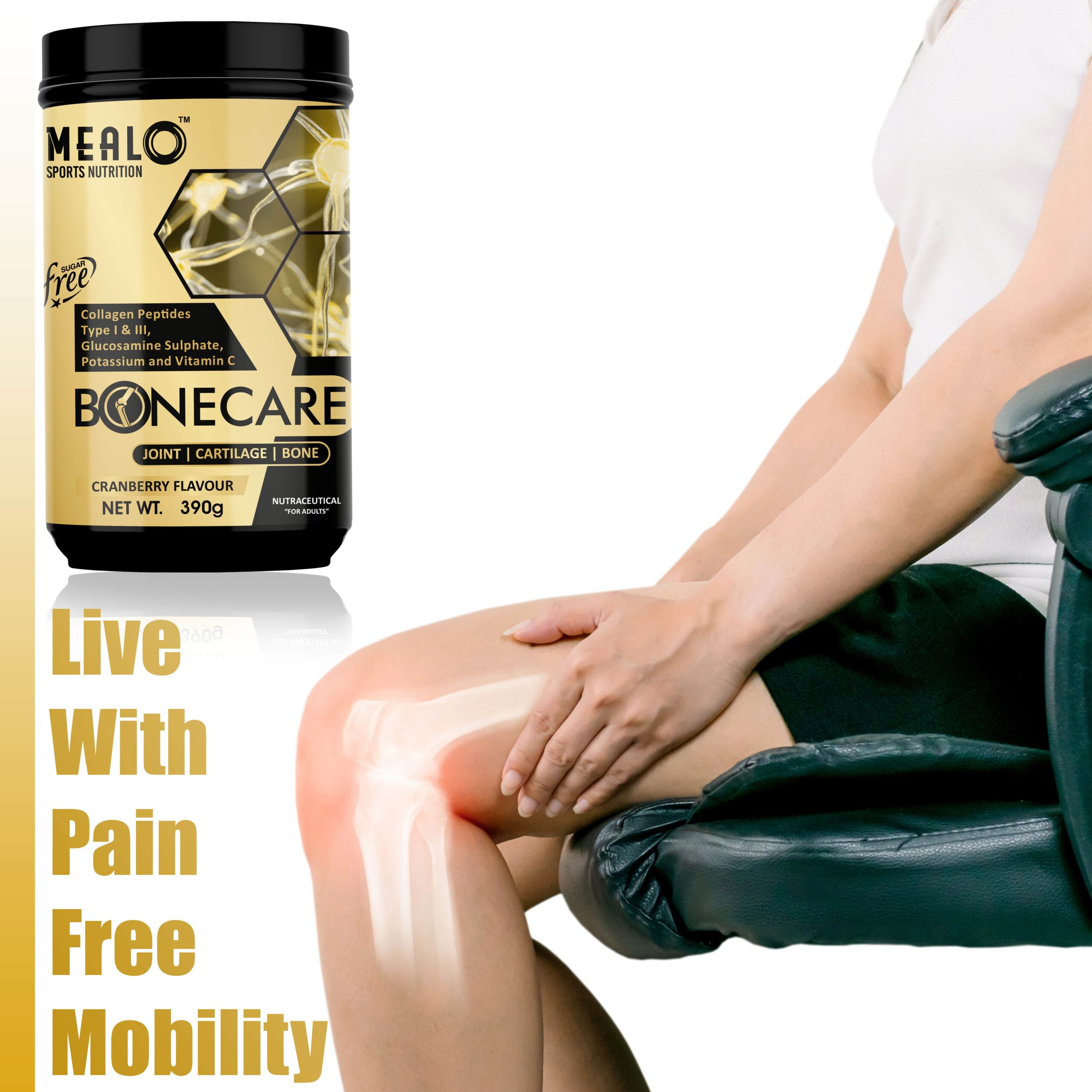 GLUCOSAMINE SULPHATE:- MealO Bone Care formulation includes Glucosamine Sulphate, Potassium Chloride which have been indicated to improve joint health., this product contains 1550mg of glucosamine per serving, which helps strengthen bones and relieve joint pain.